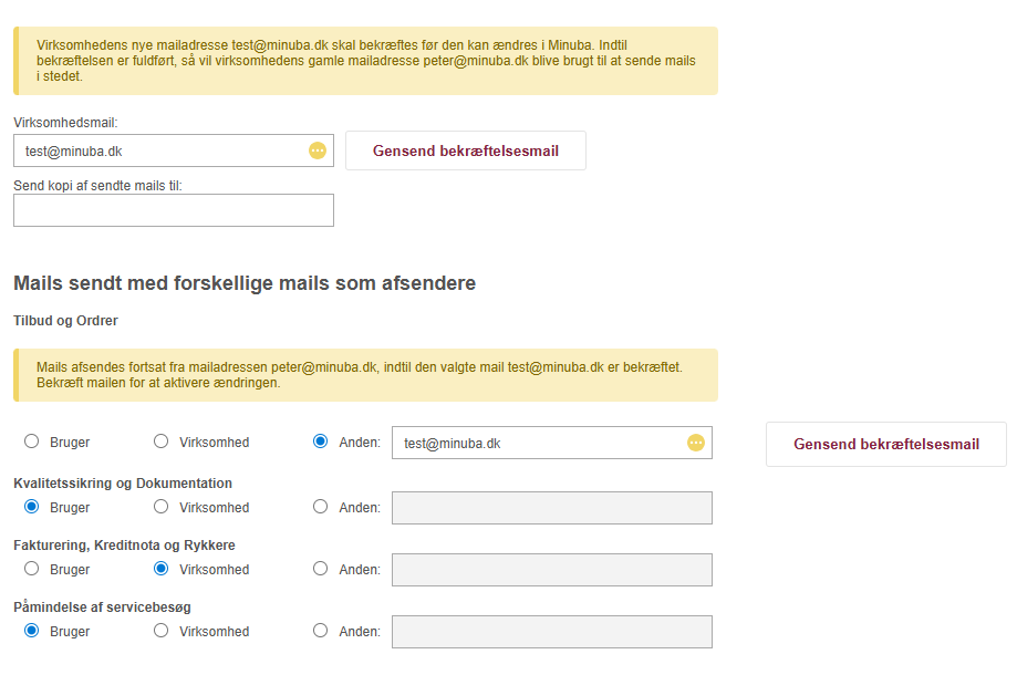 Klik på "Gensend bekræftelsesmail". Den ubekræftede virksomhedsmail vil modtage en bekræftelsesmail. Den person med adgang til mailen skal klikke på linket i mailen for at godkende den. Når mailen er bekræftet, vil den få et lille grønt flueben, som bekræftelse på, at den er godkendt.