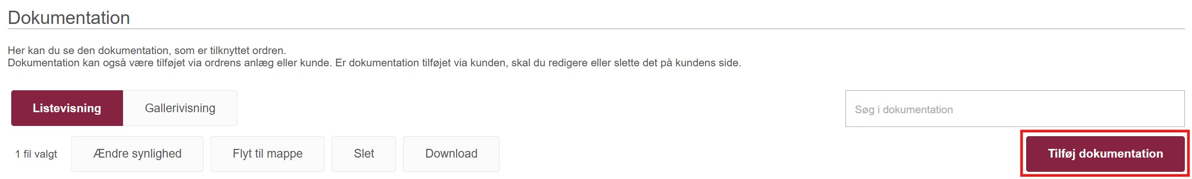 Hvis en kunde har noget dokumentation, vil dette automatisk blive overført til alle ordrer for denne kunde. Du vil herefter kunne se kundens dokumentation på ordrerne. Ønsker du at ændre i denne dokumentation, skal det foregå fra kundens side.