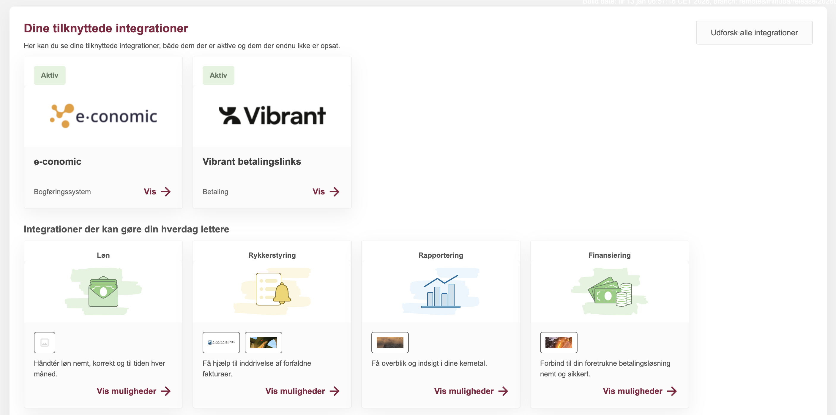På integrationssiden bliver du også præsenteret for udvalgte integrationer i forskellige kategorier, som potentielt kan være relevante for din virksomhed. Disse integrationer er endnu ikke aktiveret, men er håndplukket af Minuba ud fra, hvad vi vurderer kunne være en hjælp i din hverdag.