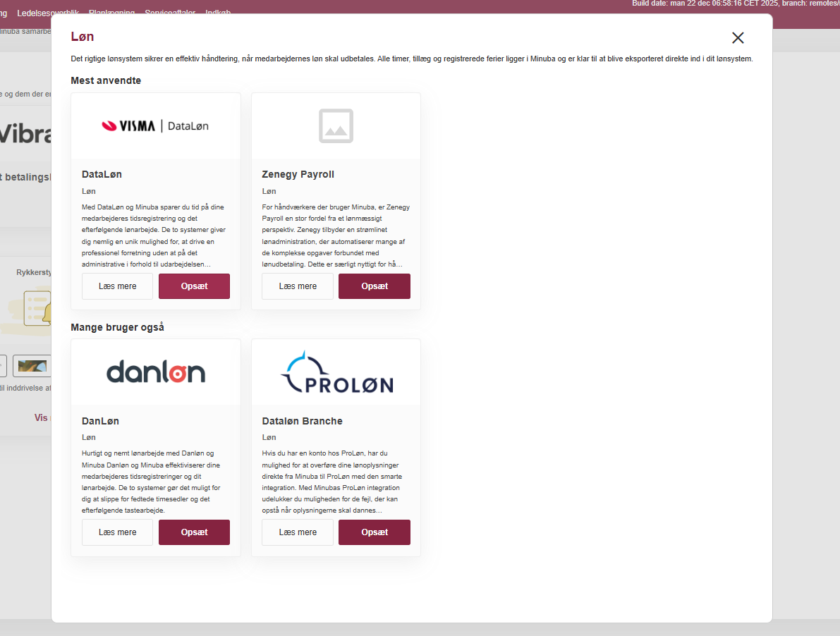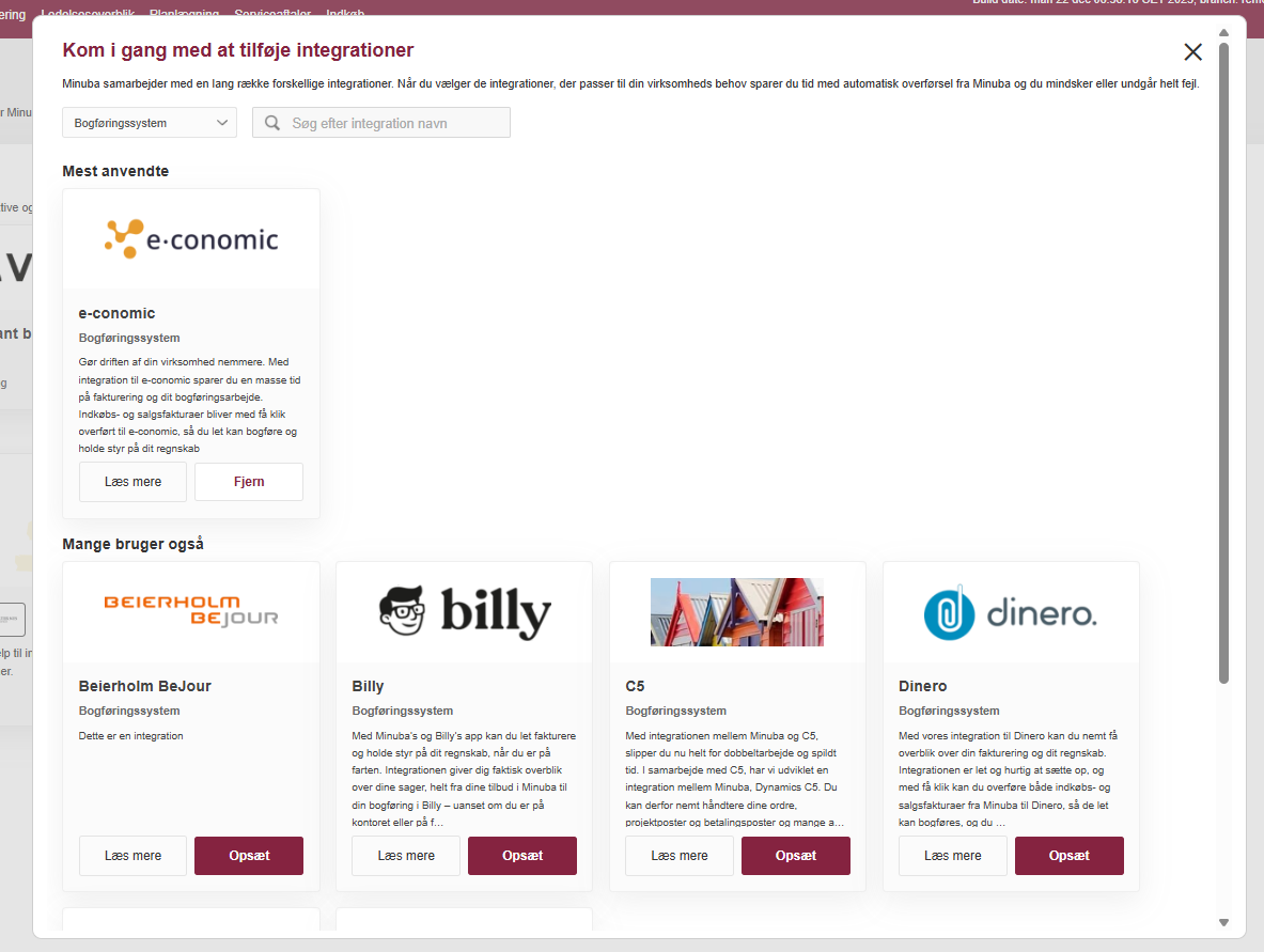 Hvis du ønsker at se alle tilgængelige integrationer i en kategori, kan du klikke på ‘Vis muligheder’ for den givne kategori. Herefter vil der åbnes en dialog med et komplet overblik over alle integrationer i den kategori, som Minuba tilbyder. Hvis en af mulighederne passer til dine behov kan du vælge at trykke på knappen ’Opsæt’. Dette aktiverer integrationen og fører dig hen til opsætningssiden, hvor du kan følge den fulde guide til hvordan du fuldt opsætter integrationen.