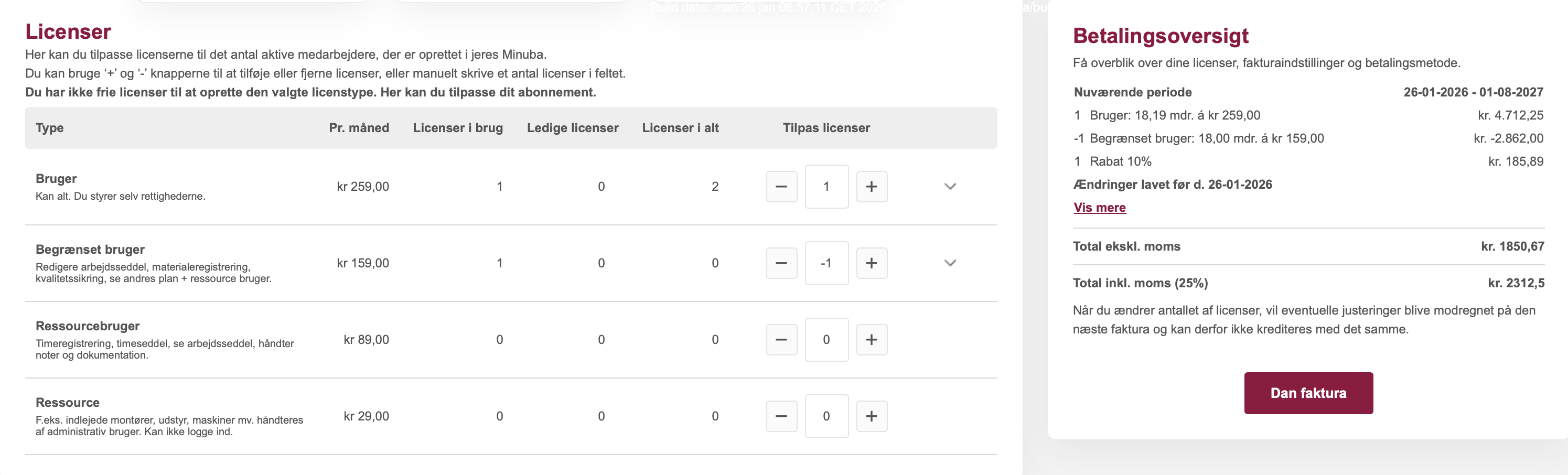 Du behøver ikke danne fakturaen, før du har opgraderet selve brugeren. Dette gør du ved at du går ind i Tandhjulet -> ’Administration’ -> ’Brugere’ og på den bruger der skal opgraderes, og vælger den nye ’Brugertype’.