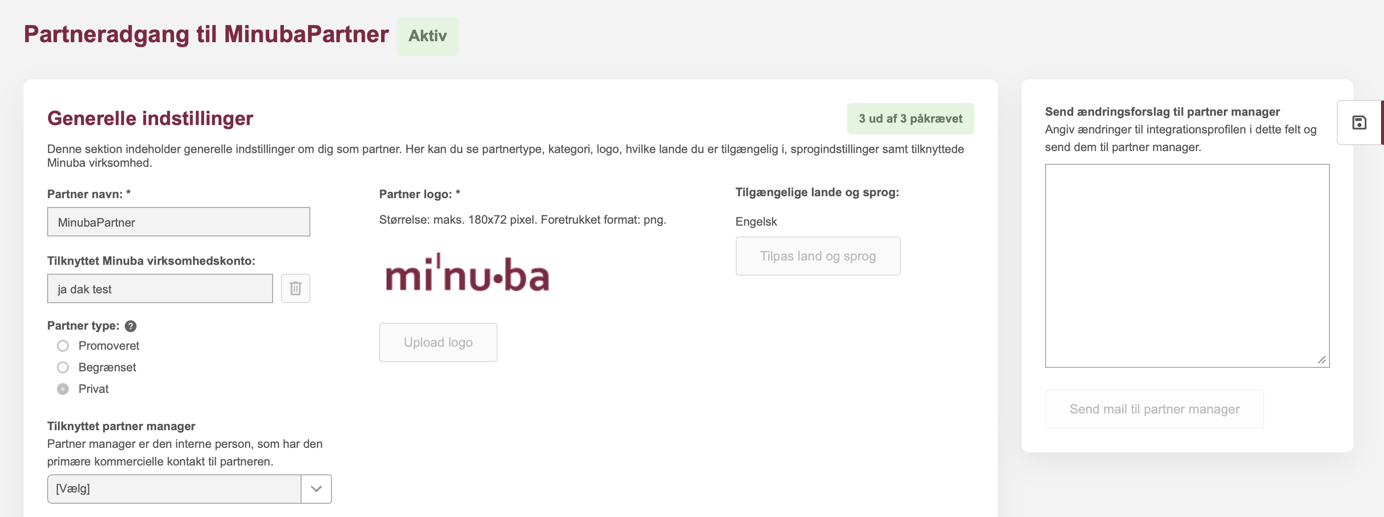 På partnersiden kan du ikke ændre noget, men du kan se informationerne der bliver vist om din virksomhed som partner i Minuba. Hvis du ønsker ændringer til partnersiden, kan du sende et forbedringsforslag til Partner Manager. Skriv i boksen øverst til højre, de forslag du gerne vil have lavet til partnersiden og klik på knappen ”Send mail til partner manager”